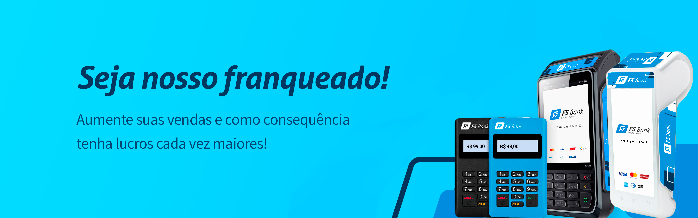"Conheço a F5 há anos. Nossa parceria é antiga. Quanto mais o tempo passa, mais confio na F5 Bank. Uma empresa justa, proativa e solidária. Quando vou escolher parceiros para expandir meu negócio, escolho as empresas do grupo F5 Bank sem hesitar. É a melhor taxa e com o melhor atendimento, sem falar no suporte inigualável.”