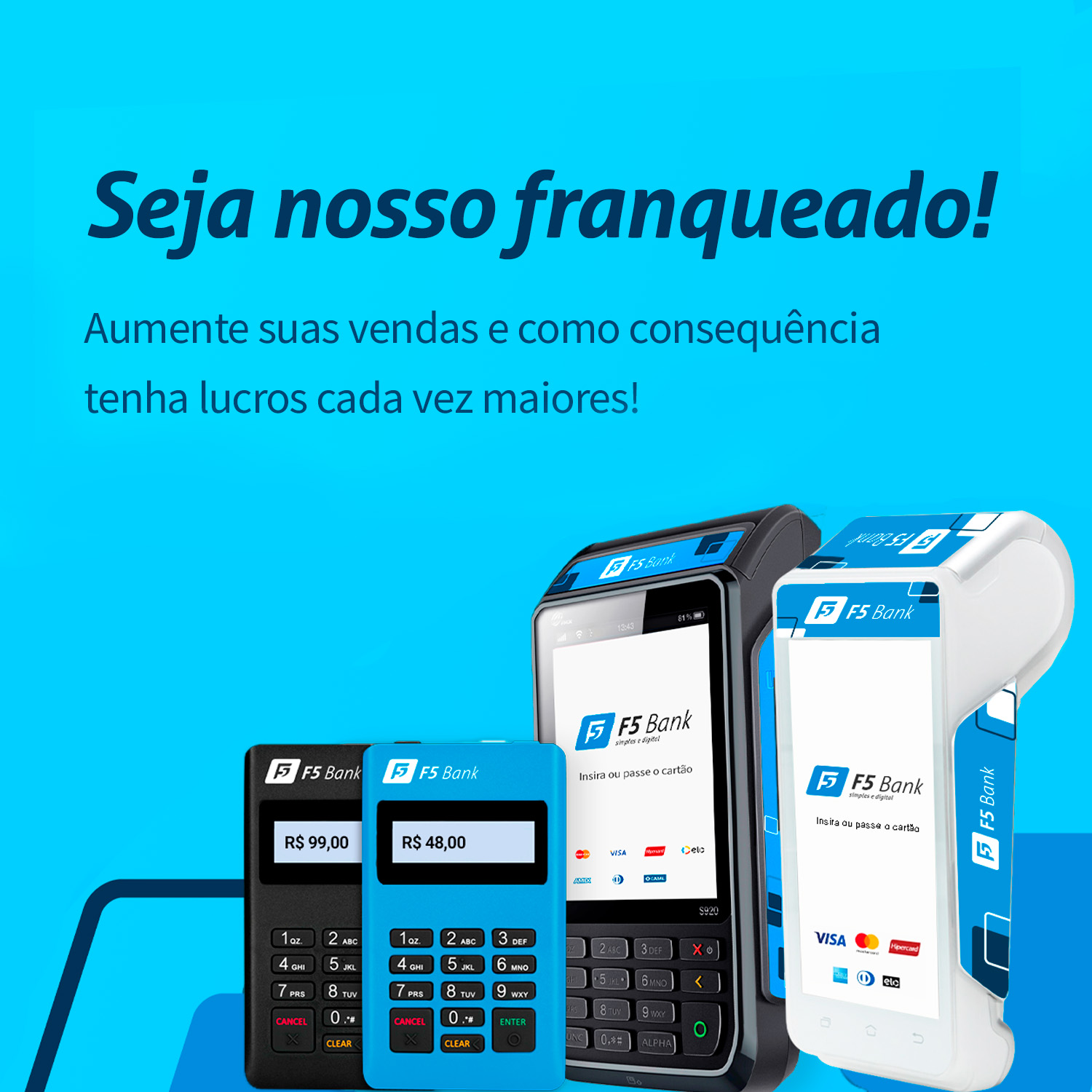 Com nossa máquina de cartão você recebe o valor das suas vendas direto na sua conta bancaria ou conta digital do F5 Bank de acordo com plano escolhido, com atendimento humanizado e sem enrolação. O F5 Bank é um banco digital simples e ágil, no qual você não precisa enfrentar a burocracia de um banco tradicional.